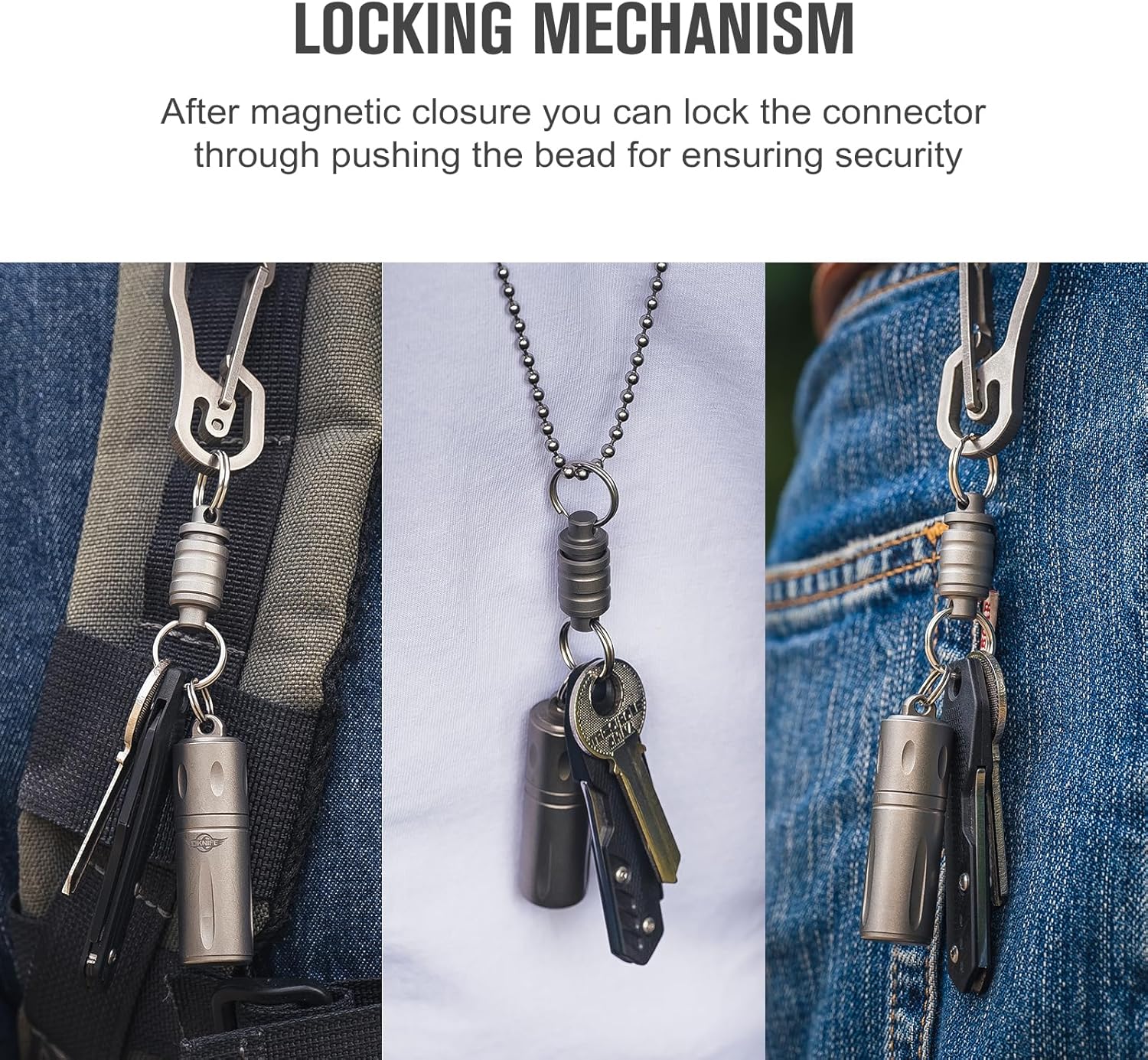 - Included, detachable key ring on both ends for connecting carabiners, clasps, keys, or other small EDC accessories/tools.
