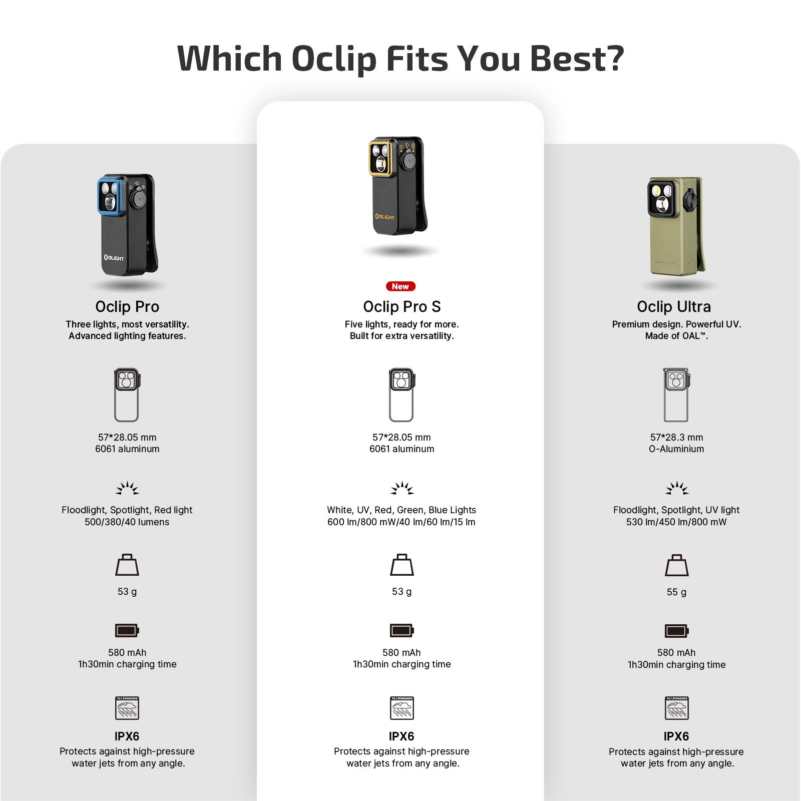 نظام إضاءة 5 في 1: مع ضوء أبيض يصل إلى 600 لومن، وأشعة فوق بنفسجية، وألوان RGB (أحمر/أخضر/أزرق)، وأنماط وميض متعددة، يوفر Oclip Pro S حل إضاءة مدمجًا واحدًا للمنزل والمهام اليدوية والاستخدام الخارجي الخفيف.