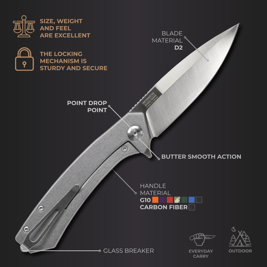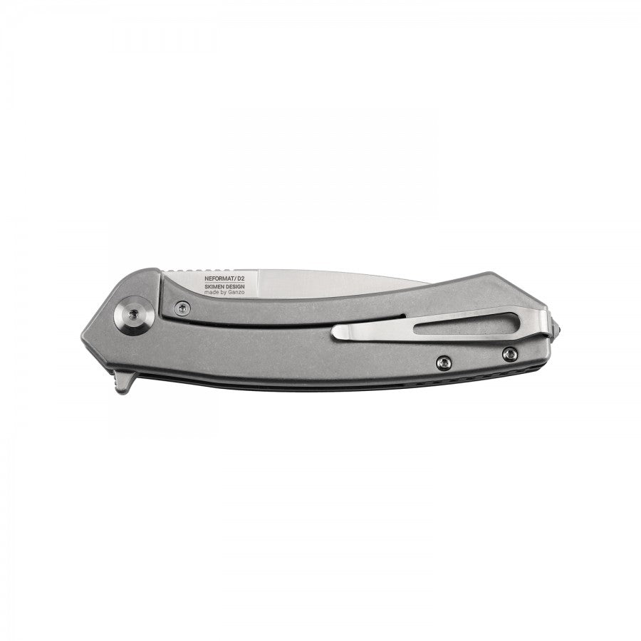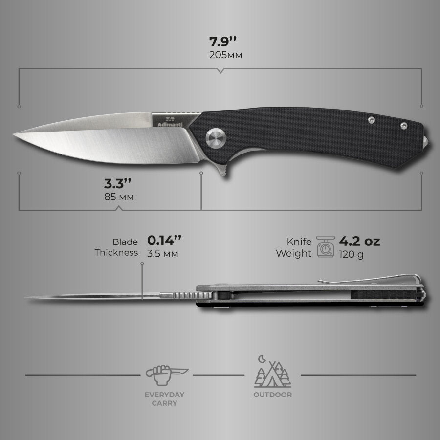 The heart of the knife is a heavy-duty, wear-resistant D2 grade steel. A corrosion-proof metal alloy shows high hardness. The hardness value of the knife is about 60 units by the Rockwell scale, which is very good for this type of product. The type of sharpening is direct. The length of the blade is eight and a half centimeters, the thickness – three and a half millimeters. The model is foldable; the blade can be got off with the help of a convenient Flipper lock. The Skimen is reliably protected against accidental opening or closing. It is safe to use and has a convenient design. The total length of the product is only 20.5 centimeters. Such compact dimensions give an advantage to the knife for everyday use. It can be easily put in a bag or pocket and used as needed, the model is always at hand.