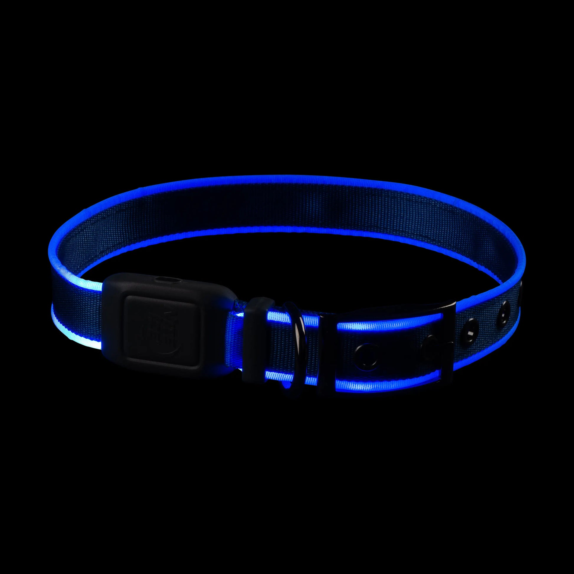 Welcome to a whole new world of nighttime visibility. Two ultra-bright LEDs send light through an integrated optical fiber to create full-length illumination so bright you need to see it to believe it. Featuring the convenience of rechargeability and easy push-button operation, this collar lights up for more than six hours on a single charge. Our optical fiber technology transmits light throughout the entire length of the collar without loss of light output and offers both constant glow and flash mode. The high-quality metal belt-buckle style closure is simple to adjust. This highly water-resistant collar is designed for ultimate durability and is available in two sizes to fit most dogs.