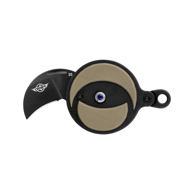 D2 semi-stainless steel blade for excellent wear resistance and edge retention. G10 handle with scale-pattern knurling, ensuring a balanced grip. Stout button lock firmly locks the blade in place when fully deployed or closed. Press the button and open it with a single shake. Sharp hawkbill-style blade with HRC 58-62 and full-flat grind. 1.34oz coin-shaped folder with artistic maze design, a stylish pendant to