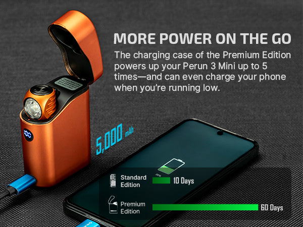 Charge More, Last Longer: With a robust 5,000 mAh battery, the case can fully charge the Perun 3 Mini up to 5 times, enabling up to 60 days of flashlight runtime. Plus, the built-in USB-C port lets you recharge your phone on the go.