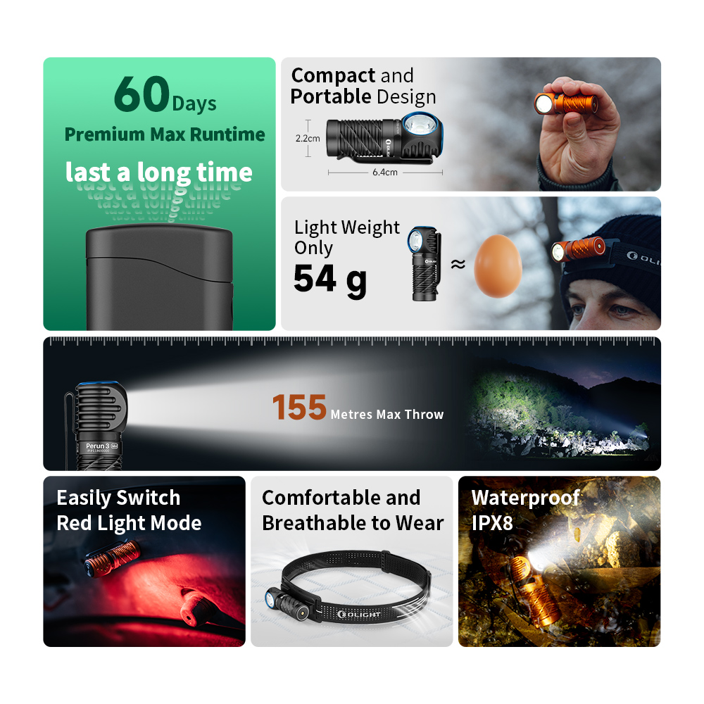White & Red Dual Light Sources: Features 5 white light modes with up to 1,250 lumens and a 155-meter beam distance and 3 red light modes for preserving night vision or signaling in emergencies.